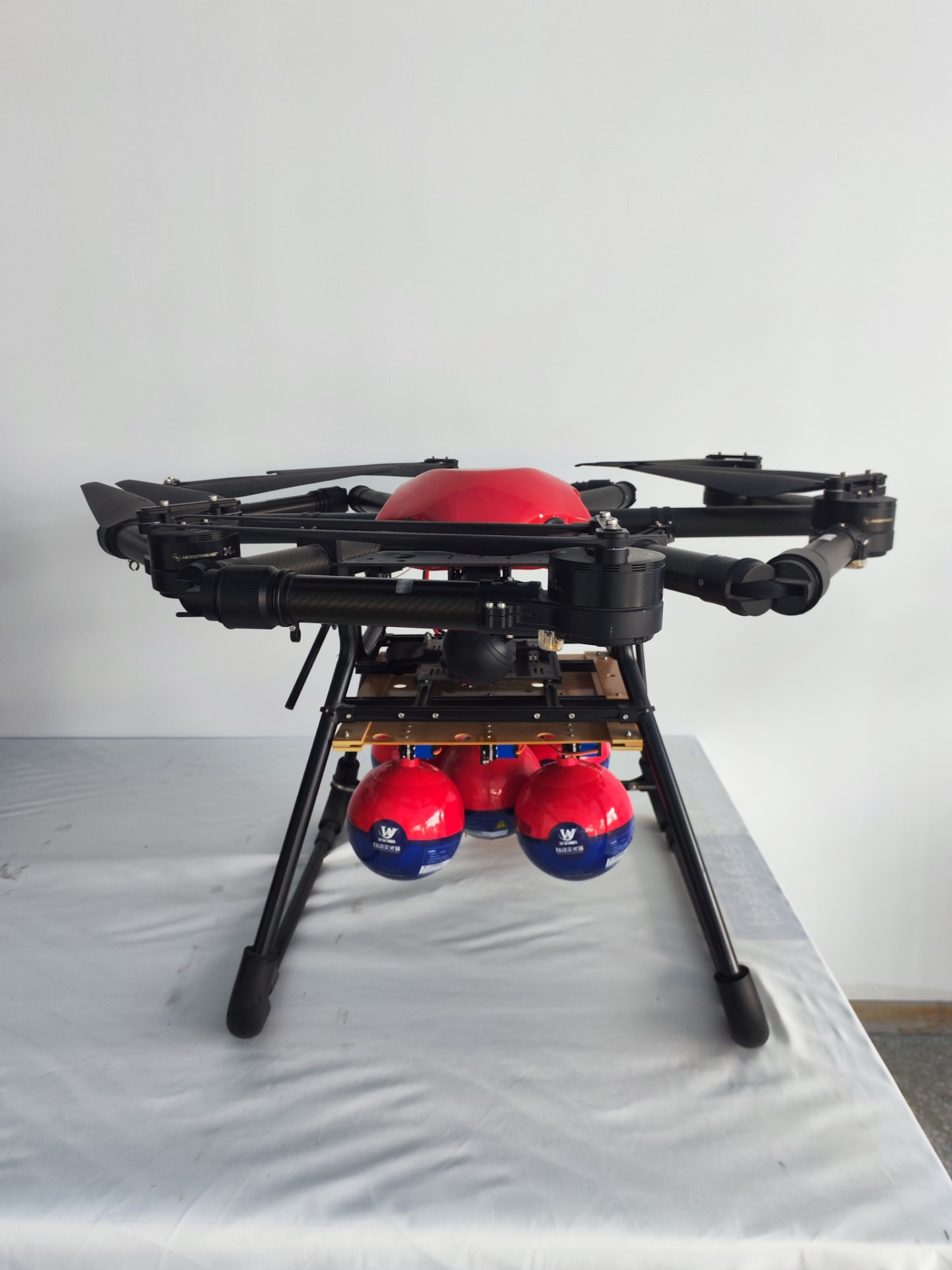 ----起飞重量108.5kg(满载 50kg)、巡航负载50kg----GPS/北斗、RTK双模块定位----飞行速度:上升3m/s、下架2m/s、水平15m/s----最大起飞海拔高度4500m、抗风等级5 级、续航时长15min----抛投系统总载重50kg,最大挂弹仓位9个,单仓最大负载45kg----单抛、顺序抛、一键全抛三种抛投模式,遥控距离>5km----配置热成像镜头